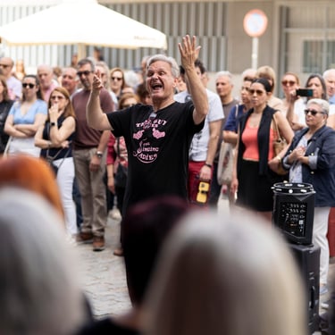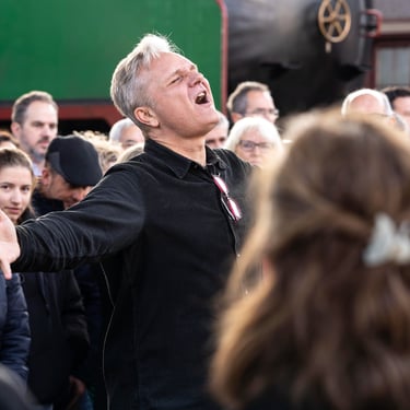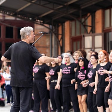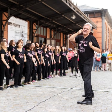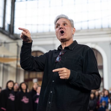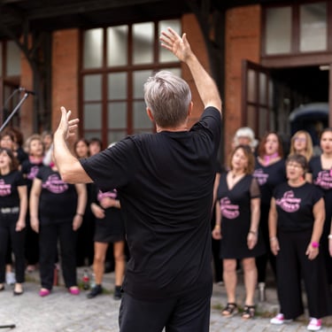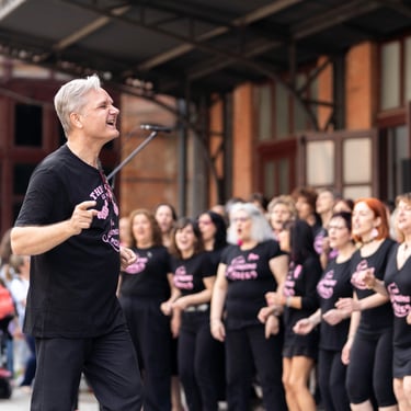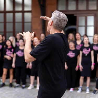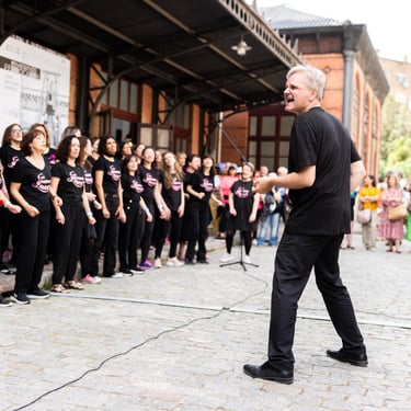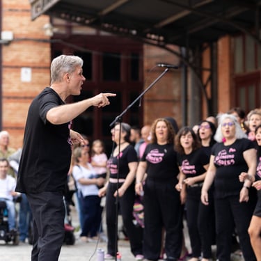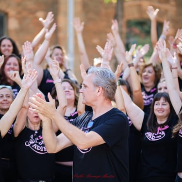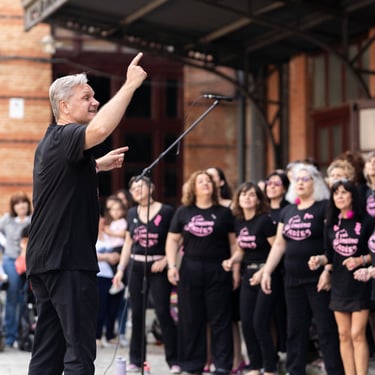 Óscar, el conductor de este coro, es polifacético y pluriprofesional: en primer lugar es un músico que sabe emocionar con la música, pero también es un tecnólogo que nos presenta a tipas como Lucy o May para que nos ayuden a aprendernos bien las canciones; además es un coreógrafo que pone a prueba nuestra motricidad y coordinación no solo haciéndonos bailar, sino ¡haciéndonos bailar y cantar a la vez!; a veces es un sabueso buscando a la criminal que desafina (qué miedo 🫣), pero en seguida llega el coach para compensar y animarnos a todas a mejorar y especialmente a las nuevas a no desfallecer; es un mimo superexpresivo que nos da indicaciones sin palabras (a mí me encanta el gesto de alargar el brazo izquierdo y simular pellizquitos con la mano derecha para indicar pelos de punta); es un profesor paciente que repite las veces que sean necesarias hasta que lo hacemos bien, y como buen profesor sabe que a veces hay que ser payaso y meter la broma para relajar (aunque esto lo teme, nos da pie y no sabemos parar 🤣🤣); es un showman que sabe entretener al público y hacerle participar; es un currante, a pico y pala para levantar un buen edificio; pero, sobre todo, es el santo y paciente Job que se atreve a dirigir un grupo tan grande de mujeres que con él disfrutan y se divierten en los ensayos y en los bolos. Es un equilibrista de todas sus "profesiones" y un pedazo de director. Me lo imagino los domingos por la tarde agotado... pero feliz 🤩