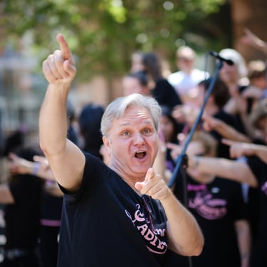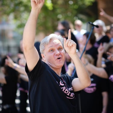 Nuestro Dire… ¿Ese señor entre tantas mujeres? Quizás no es lo que te imaginas, pero lo que sí te puedo decir es que es un mago, o posiblemente una maga en el cuerpo del director. Con su formación de músico profesional, su carisma, su saber hacer, su arte, su pasión y alegría, su humor (bueno... no siempre lo entendemos), su varita mágica y, sobre todo, gracias a la MÚSICA, crea un ambiente único y maravilloso. Consigue sacar del caos y alinear perfectamente las millones de partículas que forman a todas y cada una de las Singing Ladies. Esa mágica alineación produce mucha energía, tantísima y de la buena, que nos alegra, regocija y alcanza también a tocar los corazones de todas y todos los que nos escuchan cantar y ven bailar al mismo tiempo. Es tanta la energía que generamos, que podríamos iluminar el planeta entero. Somos una bomba, una estrella en la tierra. Y sí, es gracias a nuestro mago, gracias a nuestro Dire.